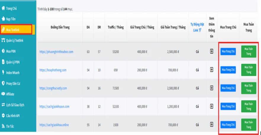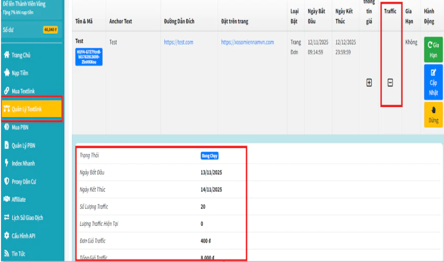 Kiểm tra đơn hàng đã mua vào mục Quản lý textlink - chọn traffic +