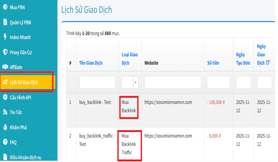 Để kiểm tra lịch sử giao dịch vào mục lịch sử giao dịch bạn sẽ thấy đơn hàng được tách ra làm 2 loại: Mua backlink để ghi nhận giao dịch của việc mua backlink và Mua backlink traffic để ghi nhận giao dịch của mua traffic cho backlink.